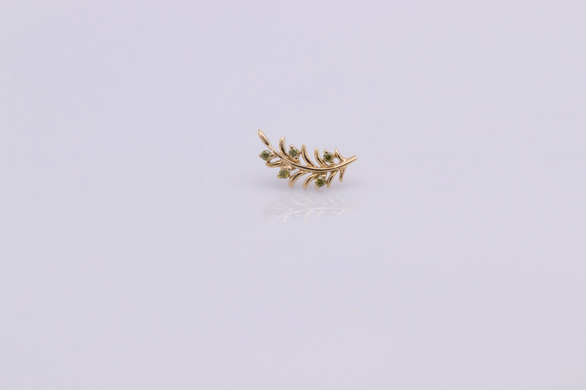 Dieser filigrane Olivenzweig aus 14 Karat Gold ist ein wahres Kunstwerk. Mit seinen fein gearbeiteten Blättern und den kleinen grünen Peridot, die Oliven symbolisieren, bringt dieses Schmuckstück die Schönheit der Natur in dein Piercing-Design. Die warmen Goldtöne harmonieren perfekt mit den grünen Akzenten und verleihen deinem Look eine einzigartige und elegante Note.